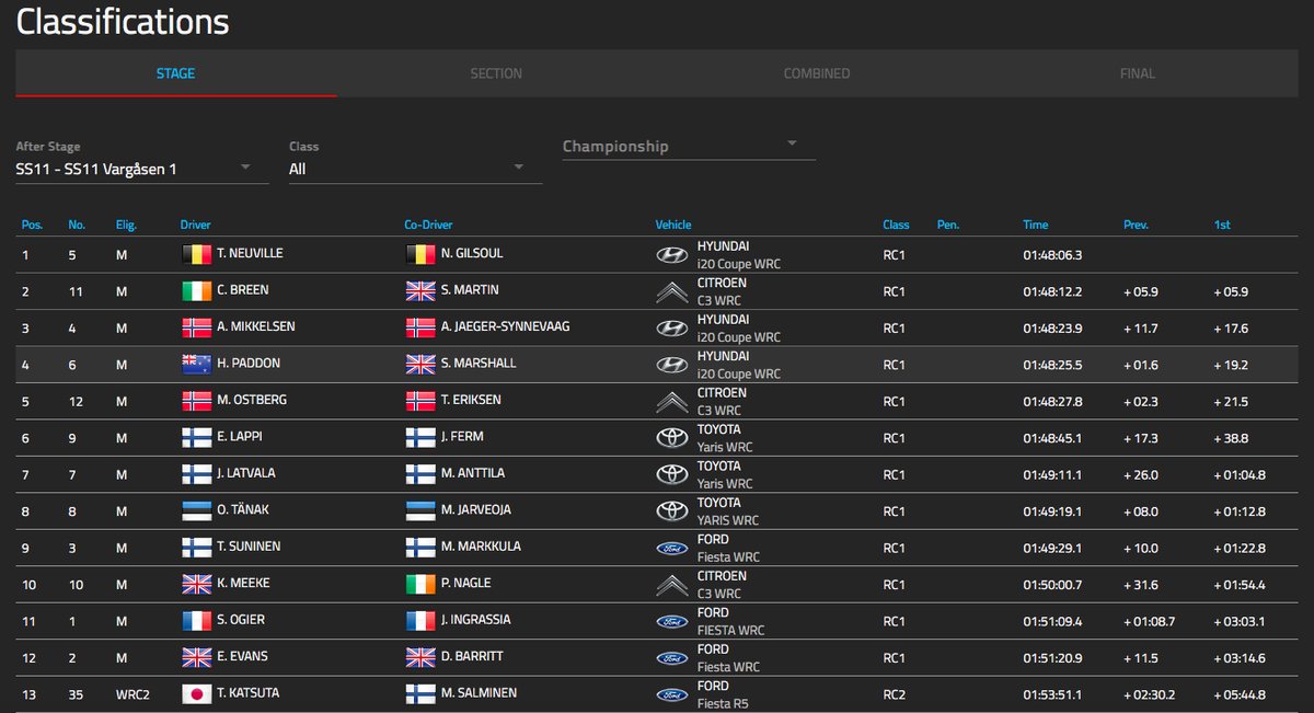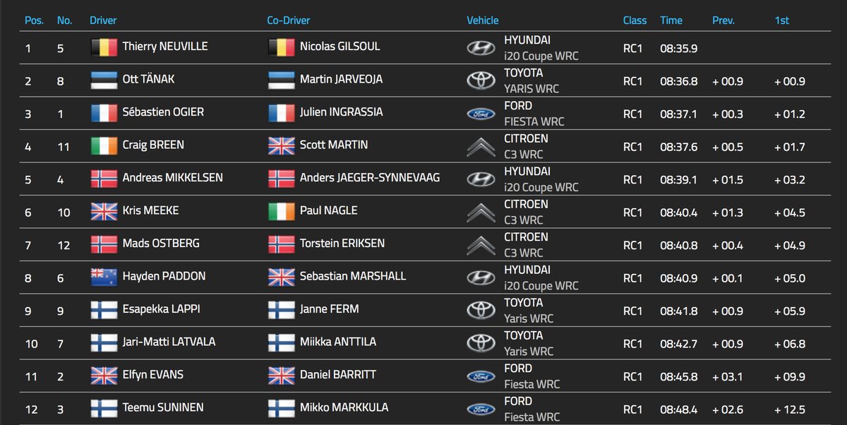 Neuville: A váltóproblémánk elektromos probléma volt, amit meg tudtunk oldani. Számításaink szerin 25-26 másodpercet veszítettünk, miközben igyekeztünk felmérni, hogy mi is történik. A második szakaszon volt egy 360°os megforgásunk, onantól kezdve igyekeztünk növelni a tempónkat. Breen nagyon igyekszik, próbál minket megelőzni az első futamgyőzelmének a reményében, jelenleg azt gondolom, hogy kézben tudjuk majd tartani a dolgokat.