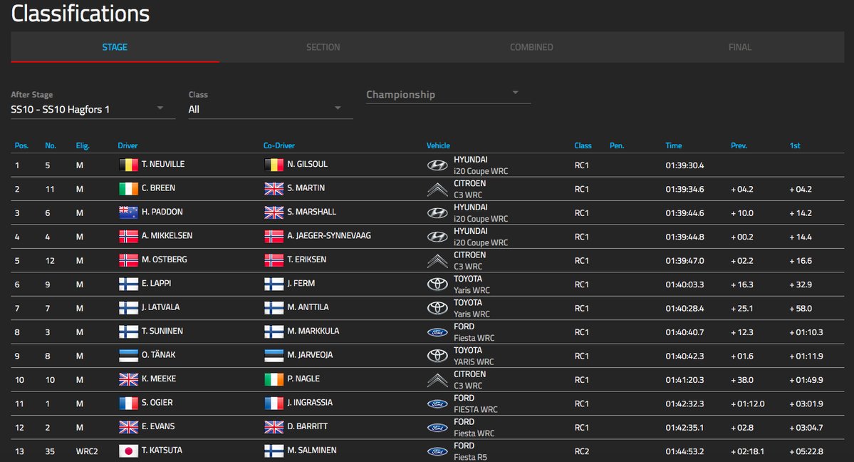 Neuville az SS10 Hagfors gyorsan bemutatott egy 360°-os megforgást és óriási szerencsével folytatni tudta. Kb. két perccel korábban Mikkelsen ugyan ott megforgatta a saját i20 WRC-jét is, ami a negyedik helyre ejtette vissza, de a délelőtti kör záró gyorsán visszakapaszkodott a harmadik helyre.